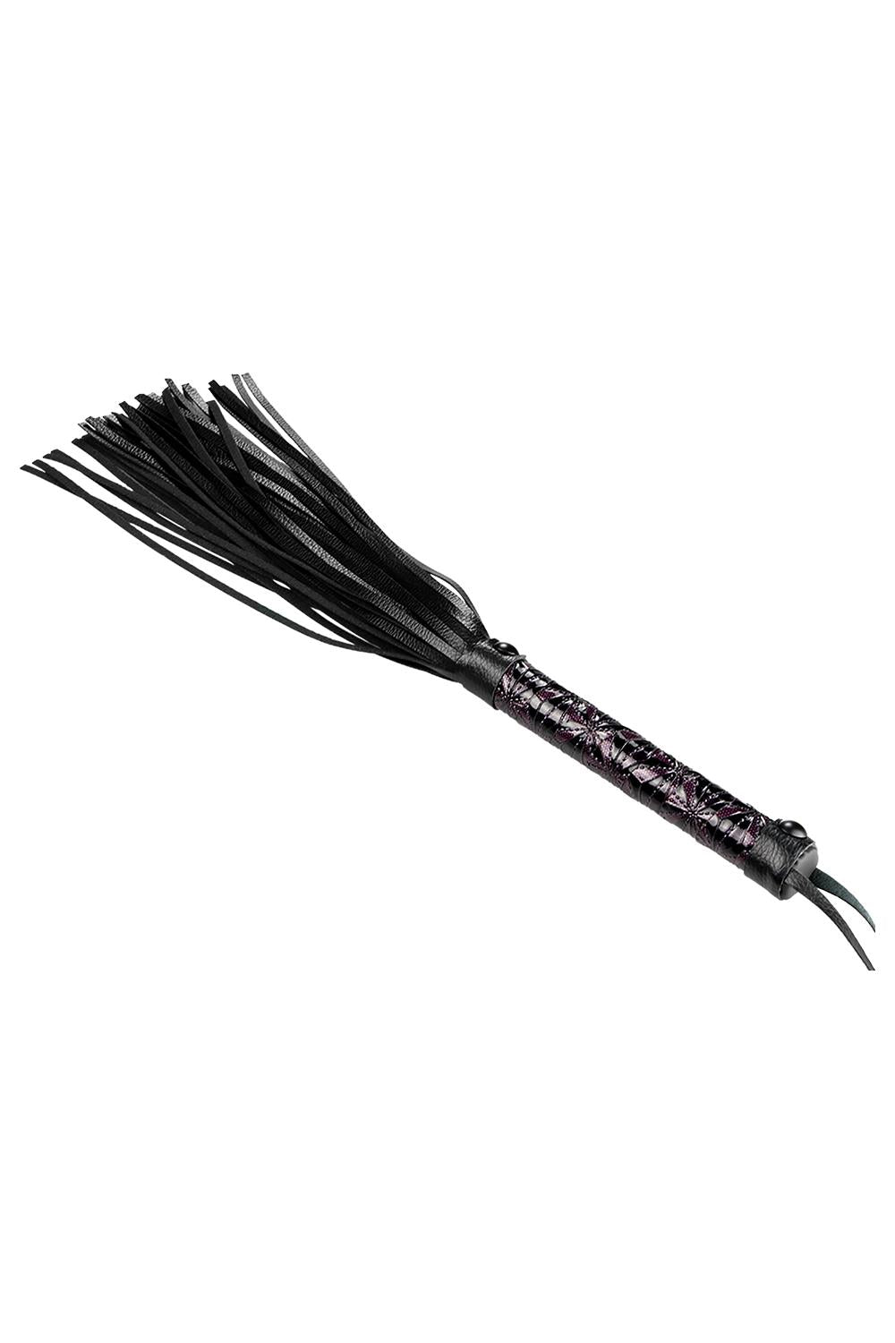 Látigo con cuerdas de 24 cm de largo. Mango de fácil agarre hecho de material de imitación de cuero con un diseño elegante y brillante en relieve en negro y morado. El látigo tiene un cómodo cordón para la muñeca.
