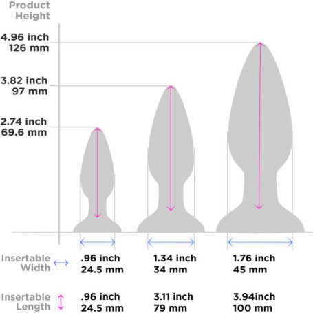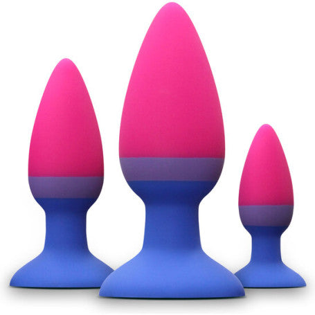 El kit incluye tres plugs multicolores de tamaños graduados, con cuellos largos y puntas cónicas para una fácil inserción. Esto te permite comenzar con el tamaño más pequeño y avanzar gradualmente a medida que te sientas más cómodo, ya sea en solitario o en pareja.